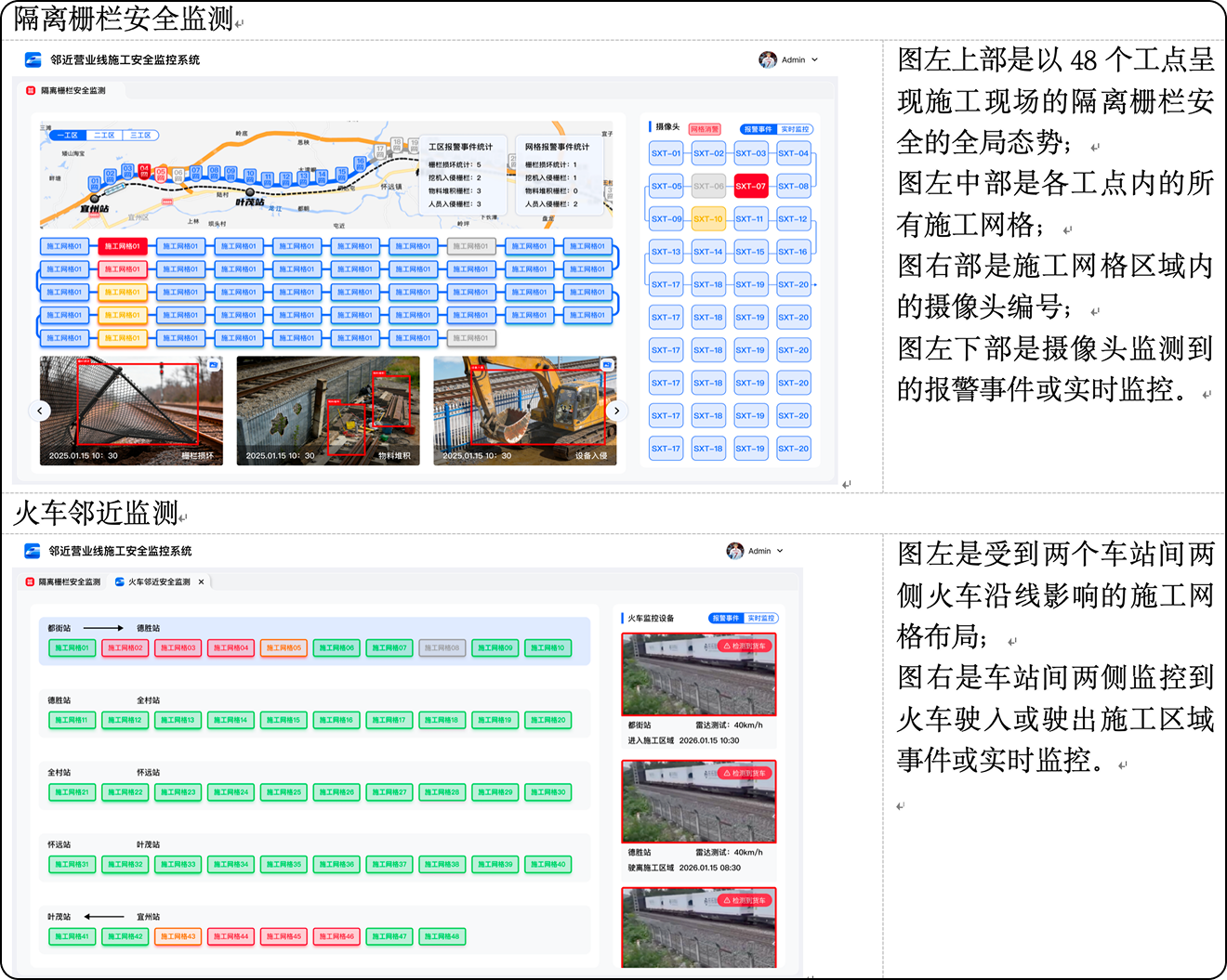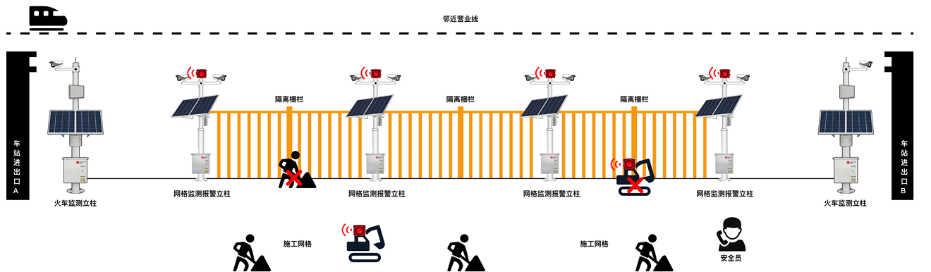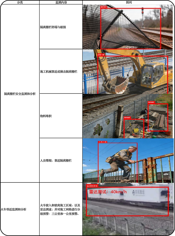 营业线旁施工安全监控系统主要功能包括:隔离栅栏安全监测和分析、火车邻近监测和分析、施工安全监测和分析、以及联动报警处置