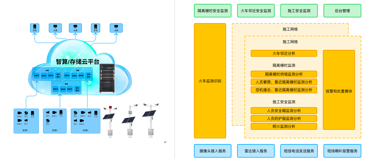 营业线旁施工安全监控系统是根据网格化施工组织模式,对邻近营业线施工风险进行智能化、自动化的安全监控系统:通过物联网实时采集邻近营业线施工现场的视频和雷达等传感器数据,通过智算/存储云平台进行智能检测,通过物联网和电话网进行现场报警。