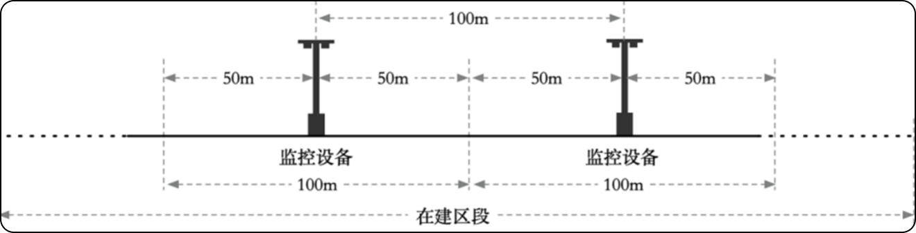 火车监测立柱安装在施工场地两端500米,离火车营运线10米~20米处。